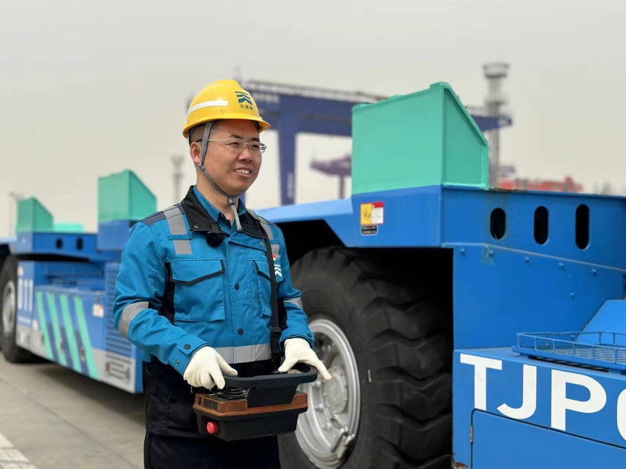 在天津港全球首个“智慧零碳”码头,近百辆无人驾驶的人工智能运输机器人正大显身手。它们背着10几米长的集装箱往来穿梭,精准又迅速地抵达自动化岸桥,送集装箱吊装上船。远在百米开外的观景廊道上,全国劳模、天津港第一港埠有限公司拖头队副队长成卫东密切注视着这些“机器人徒弟”的表现。