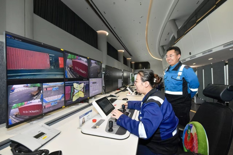 成卫东:先进的技术和港口生产流程进行了深度融合,从而产生了新质生产力。现在,我们的操控司机一个人同时远程操控6台大型起重设备,效率以后也会翻倍提升。我们国家未来的强大、经济的繁荣已经进入了一个不可逆转的快车道,我们现在要提前做好准备。