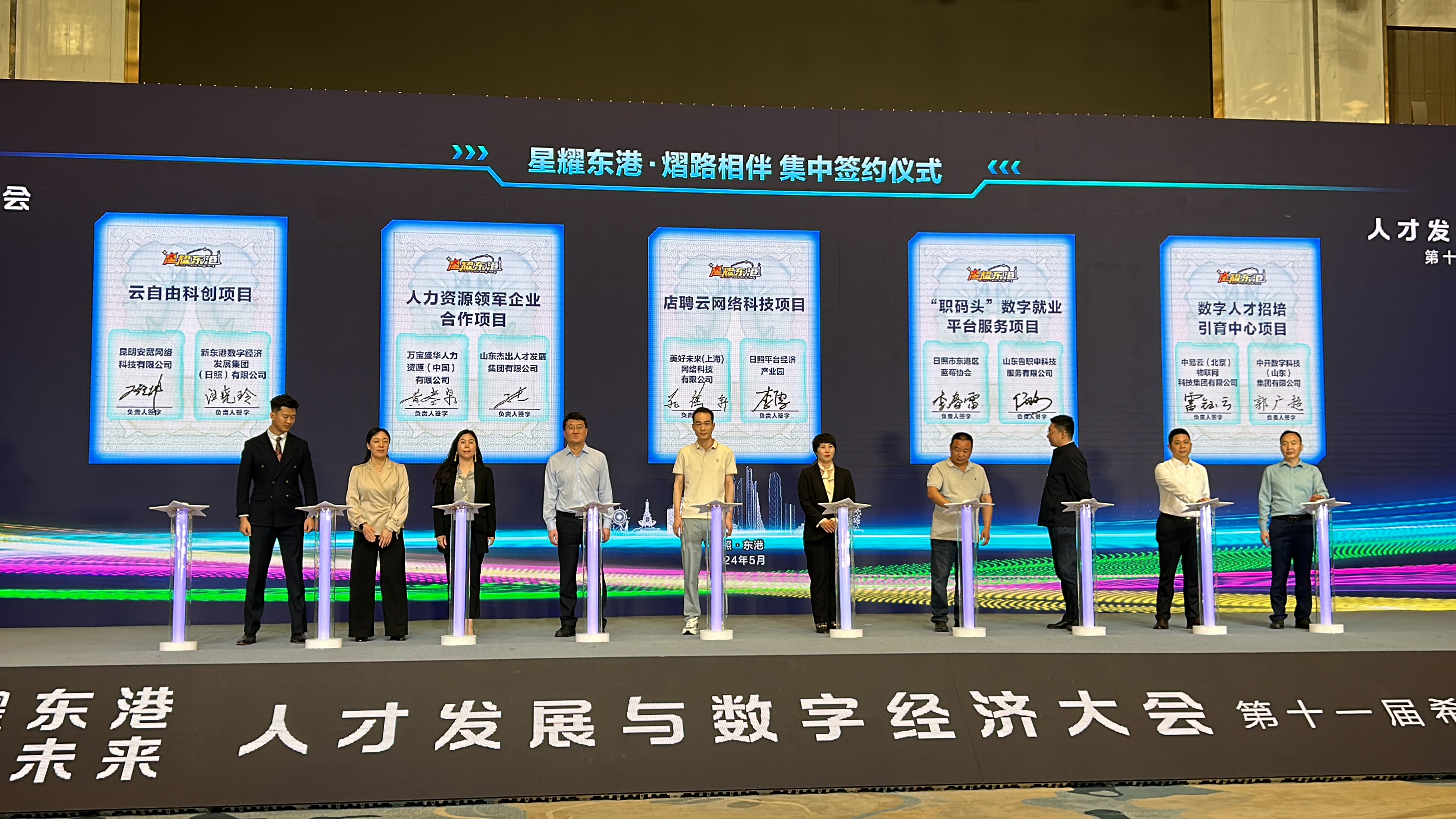 本次大会进行了“星耀东港·熠路相伴”集中签约仪式,由数字服务外包招商项目签约、高校产教融合项目签约,以及标准化数字服务战略合作三项组成。日照平台经济产业园与美好未来(上海)网络科技有限公司签约店聘云网络科技项目,更好的为东港互联网服务外包业发展贡献平台力量。