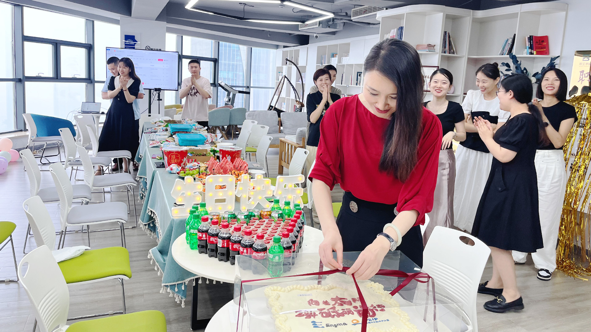 在突然响起的生日歌中,为七月寿星们准备的神秘惊喜出现。热情的鲜花、精美的生日蛋糕、温馨的礼物,让寿星们感受到了来自团队的浓浓关爱。
